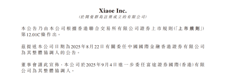 8月12日,港交所文件显示,XiaoeInc.(小鹅通)进一步委任富途证券国际(香港)有限公司为整体协调人。