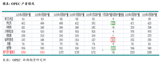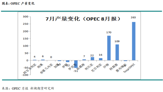 OPEC 8月报显示OPEC 7月产量环比增加26.3万桶/日至2754.3万桶/日,增量主要在沙特(17万桶/日)、阿联酋(10.9万桶/日);减量主要在伊拉克(5.1万桶/日)及伊朗(1.2万桶/日)。8个增产国实际产量低于目标增量8.4万桶/日,其中哈萨克斯坦产量高于目标产量31.3万桶/日,而伊拉克和俄罗斯产量显著均低于其目标产量,俄罗斯低于目标产量12万桶/日,伊拉克低于目标产量22万桶/日;沙特和科威特产量略低于目标产量。