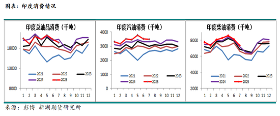 印度方面,7月油品消费1942.7万吨,同比减少4.02%,环比减少3.93%;汽油消费349.3万吨,同比增加5.93%,环比减少0.83%;柴油消费736.3万吨,同比增加2.36%,环比减少9.13%;航煤消费71万吨,同比减少2.34%,环比减少2.81%。近期印度消费处于淡季,环比有所走弱,但2025年消费增量仍值得期待。